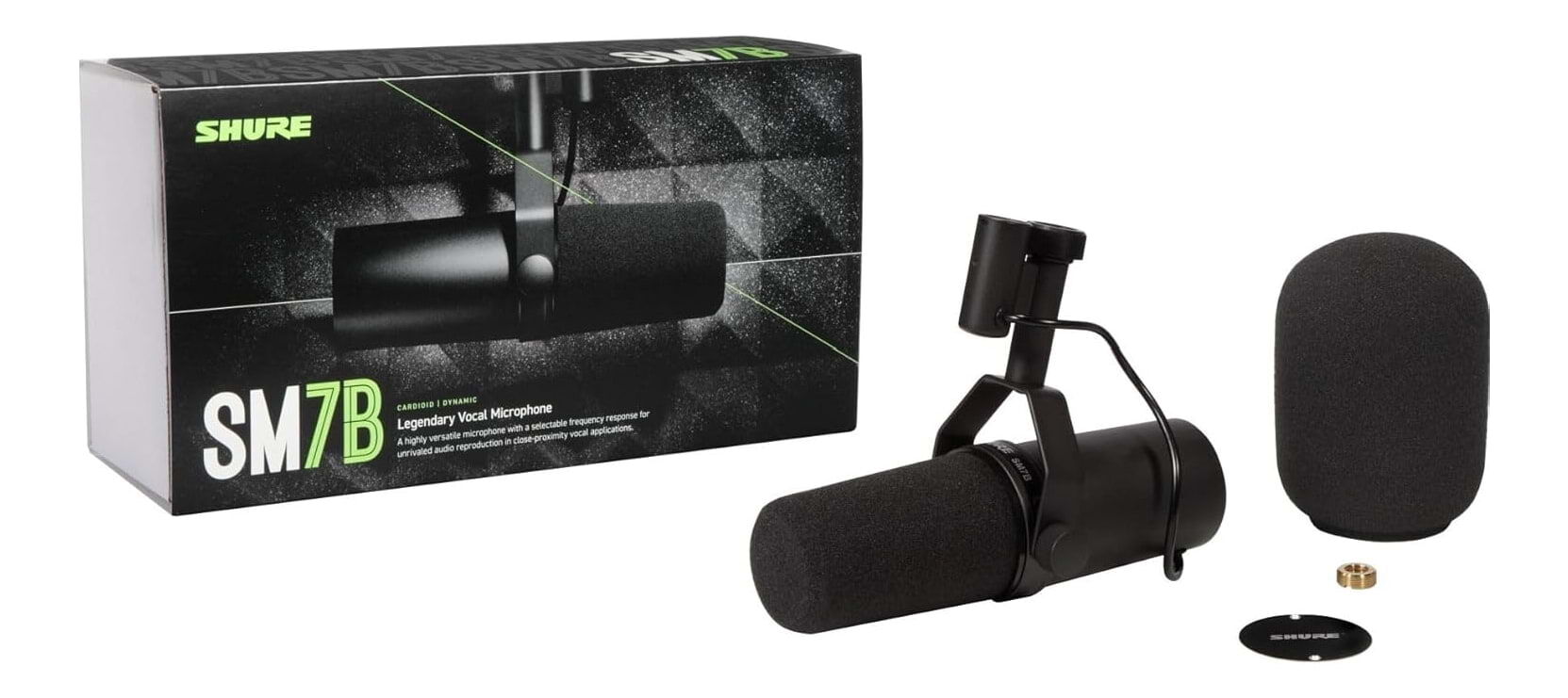 The SM7B dynamic microphone has a smooth, flat, wide-range frequency response appropriate for music and speech in all professional audio applications. It features excellent shielding against electromagnetic hum generated by computer monitors, neon lights, and other electrical devices. The SM7B has been updated from earlier models with an improved bracket design that offers greater stability. In addition to its standard windscreen, it also includes the A7WS windscreen for close-talk applications.