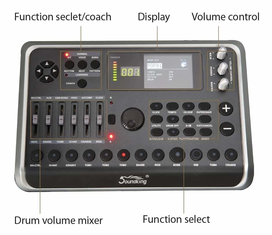• Versatile sounds – Access a wide range of drum and percussion kits with effects and backing tracks.