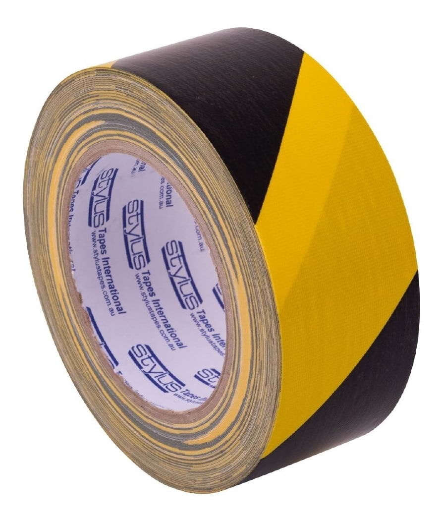 The Stylus 210 Hazard Cloth Tape durable, hand-tearable cloth tape featuring bold black and yellow hazard stripe patterns. It’s coated with a thick natural rubber adhesive, ensuring strong tack and visibility, yet remains removable. Waterproof, versatile.