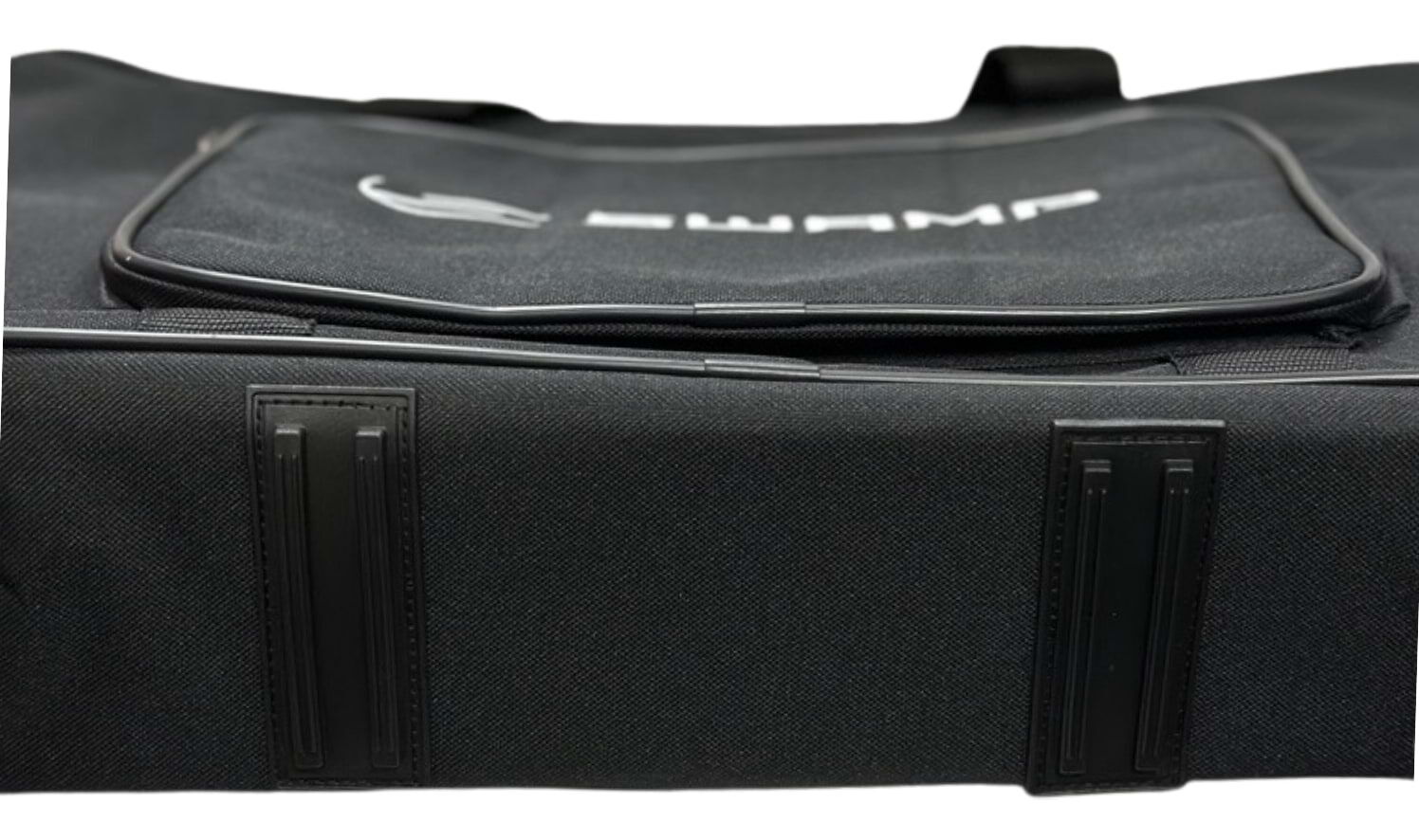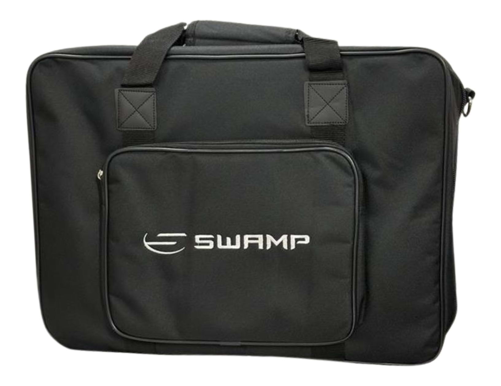 The SWAMP Small-Medium size pedal board with padded gig bag, a great convenient pedal board and transport solution. Gaps between rungs for cable management, underside frame for power supply, great protection, strong carry handles, shoulder strap.