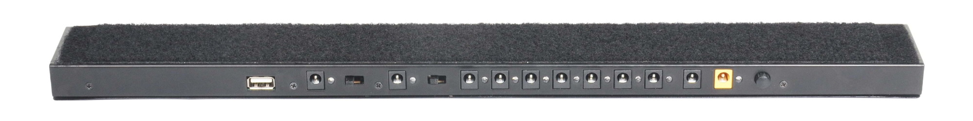 A fantastic Powerbank solution for the SWAMP pedal boards. This rung has 10 power outputs - 7x 9V 300mA, 2x 9/12/18V switchable 500mA outputs, 1x USB 5/2A output and 1x 12V paralleled output. Enough juice to power a huge suite of pedals for your pedal bridge.