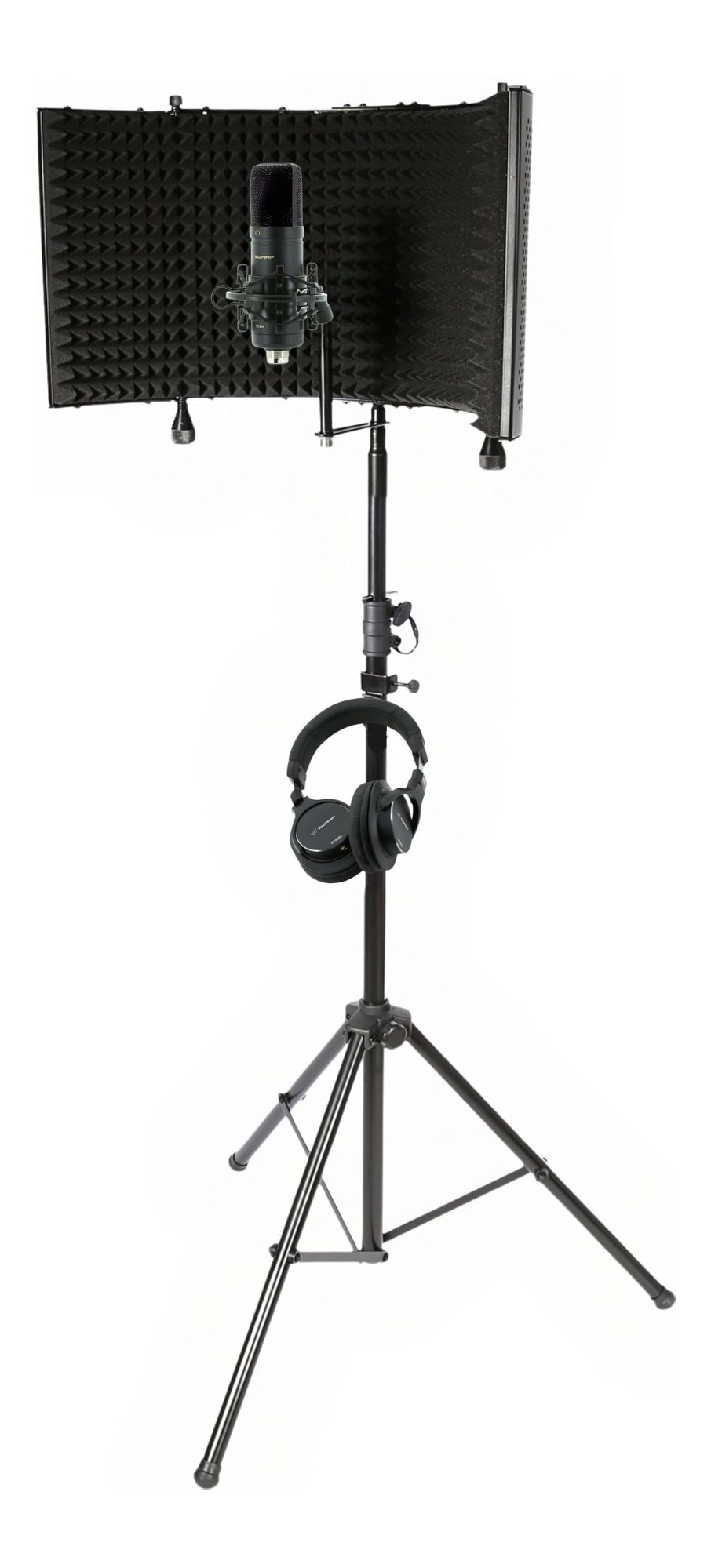 Here is a perfect starting package for recording vocals in your home studio. Featuring the SWAMP SI05 Reflection Filter with stand, the SWAMP SC200 large diaphragm Studio Condenser Mic, HP820x studio headphones, and a pop filter, shockmount, XLR cable. Optional audio interfaces, so you have everything you need to start recording.