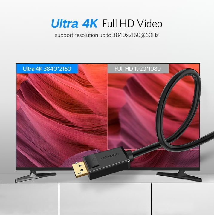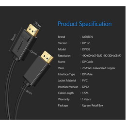 2m Length - This Ugreen Premium Displayport 1.2v Male to Male Cable enables you to connect Displayport devices, support 3D and resolution up to 3840 x 2160. With gold-plated connectors, 28AWG OFC conductors, it's a perfect cable for perfect audio and vide